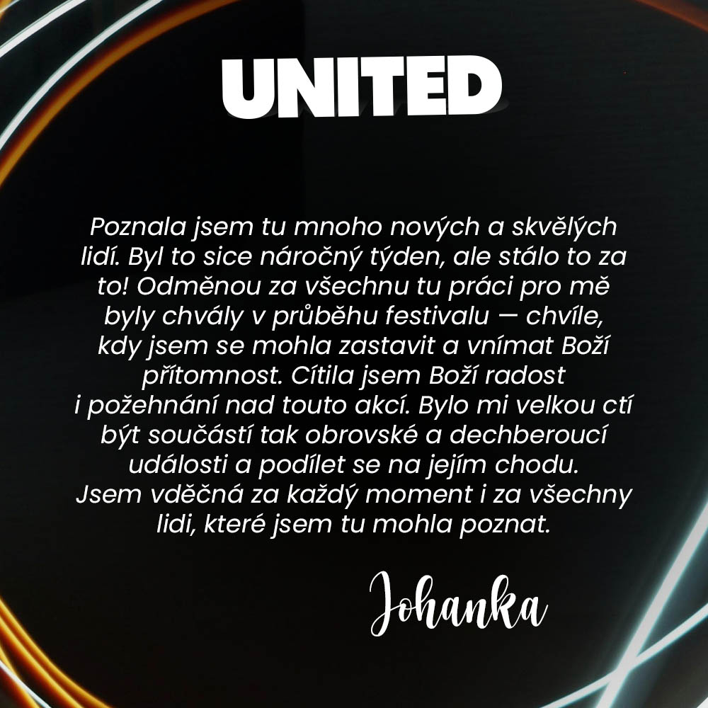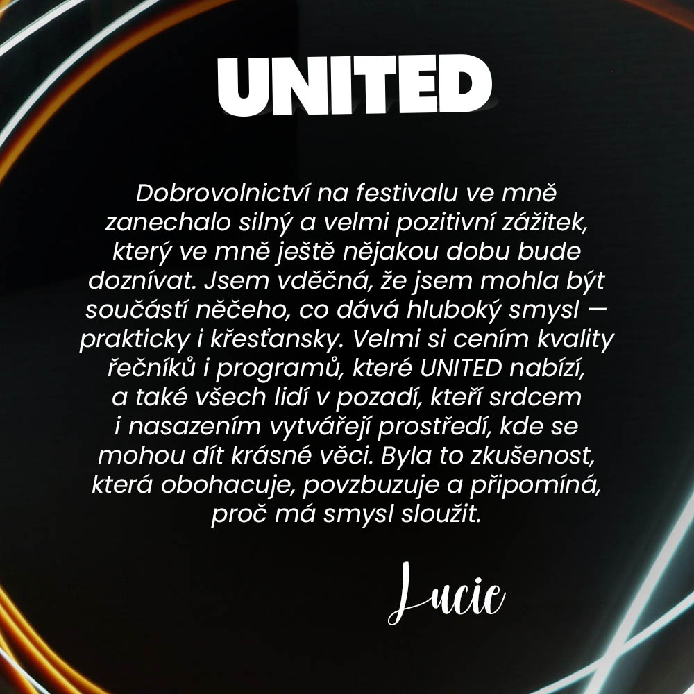 Dobrovolnictví na festivalu UNITED má mnohem větší rozměr, než se na první pohled může zdát – i díky tvému zapojení budou moct noví lidé přijít za Pánem Bohem a zažít Boží dotek. Je to skvělá příležitost posunout se v životě dál a být součástí akce, která zasáhne nejen tebe